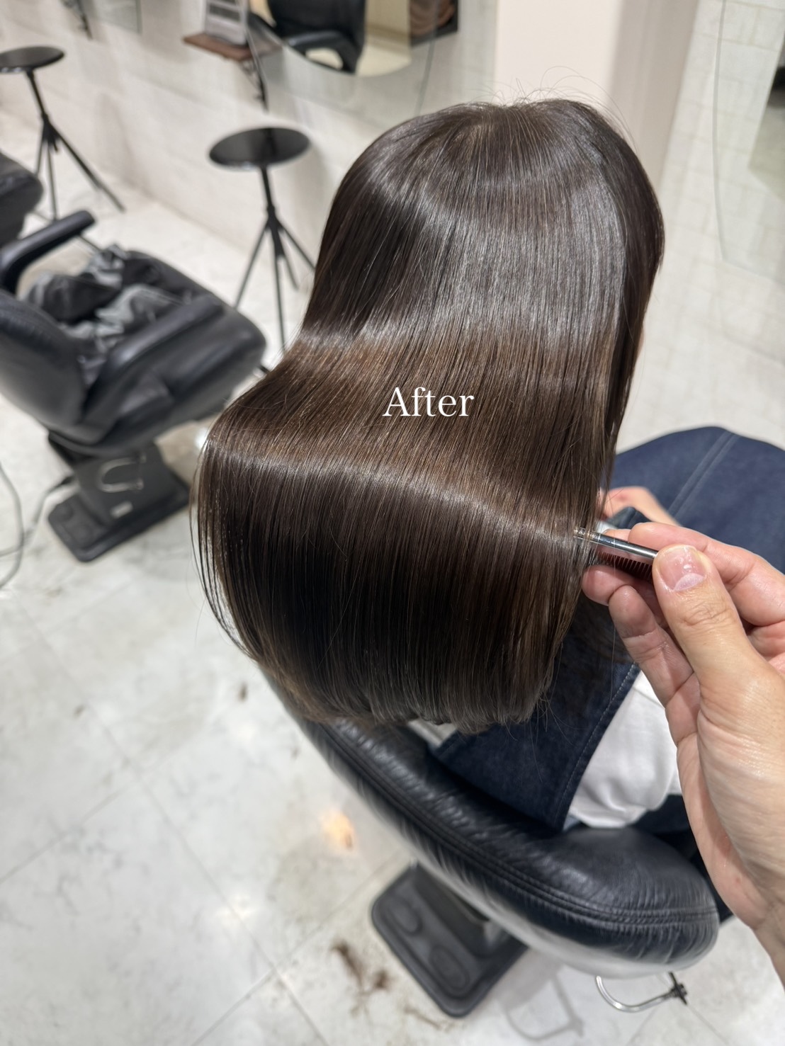 アルカリ酸熱トリートメントとカラーを同時に行うことができるため、カラーダメージを極力抑えながらも酸熱トリートメントのツヤを叶えることができるということです。